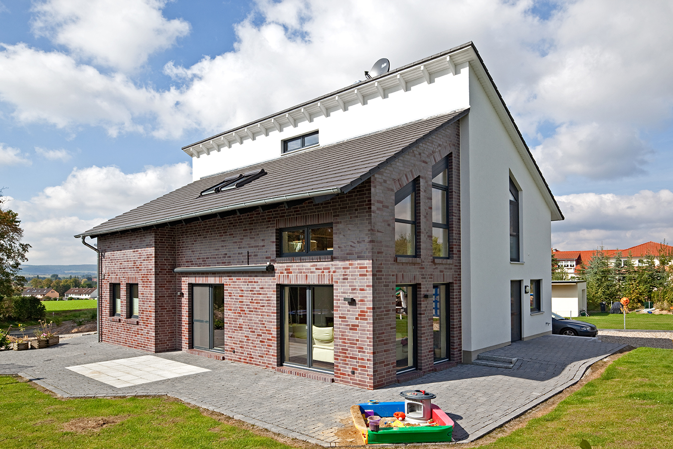 Das klassische Haus Junker mit seinen klaren Linien, dem imposanten Zwerchgiebel, den farblich changierenden Verblendsteinen und der grünen Landhaustür ist Wohngefühl pur.