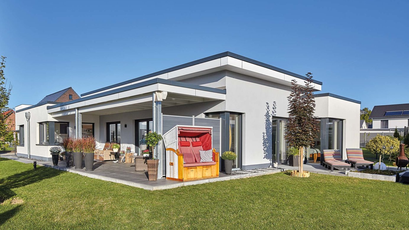 Eingeschossige Gebäude sind unter Bauherren gerade sehr im Trend. Zurecht, denn Bungalows sehen nicht nur stilvoll aus, sondern sind obendrein eine hervorragende Vorsorge für die Zukunft. Ein Bungalow Haus kommt gänzlich ohne Treppen aus und ermöglicht somit barrierefreies Wohnen im Alter, aber auch sichere Bewegungsfreiheit für Kleinkinder. Der Haustyp kann in unterschiedlichen Bungalow Grundrissen realisiert werden, wie beispielsweise der U-, der Winkel- oder der Quadratform. Als Dachform eignen sich insbesondere Sattel-, Walm- und Pultdach.
