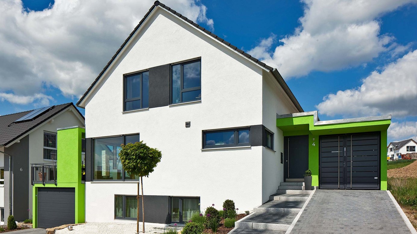 Neben dem frischen Grün der oberen Garage fallen von Außen am Haus der Familie Thiel besonders die dazu reduzierte weiße Putzfassade, das schwarze Dach und die großzügigen schwarzumrahmten Fensterflächen auf.
